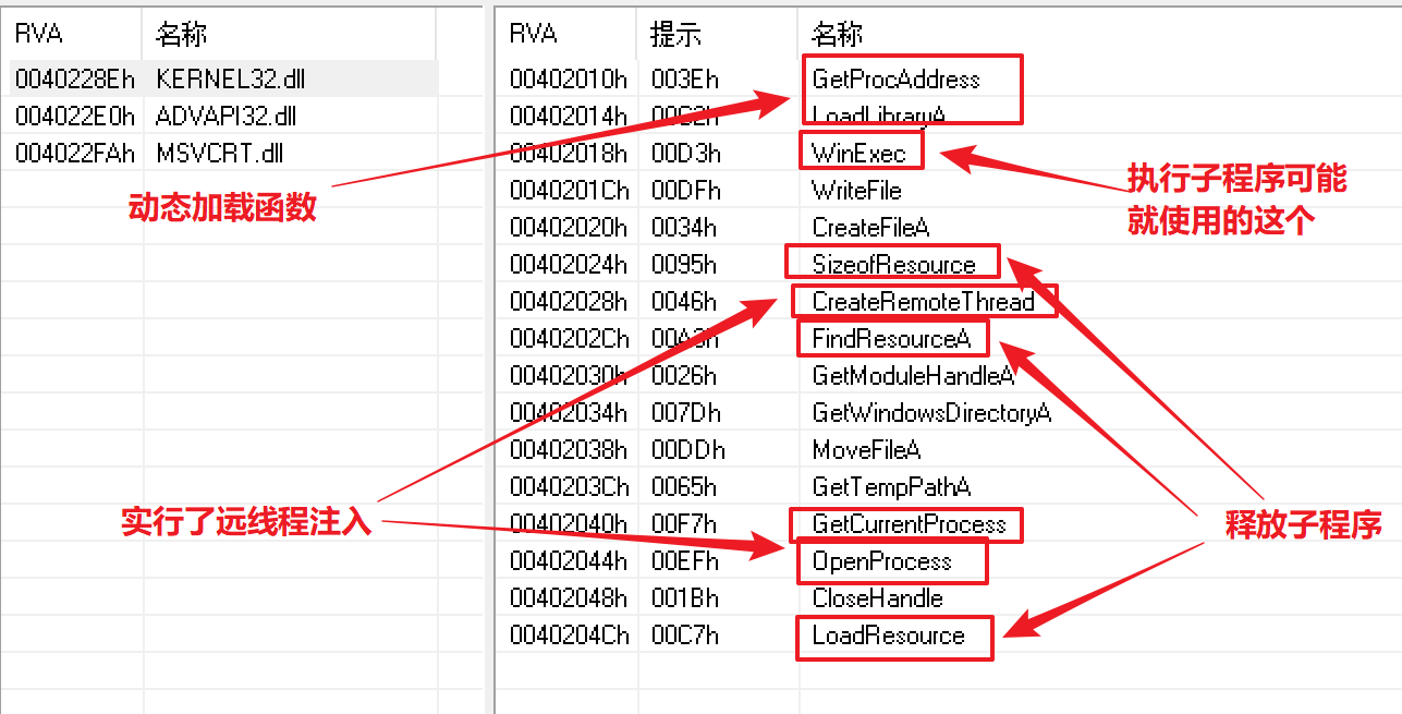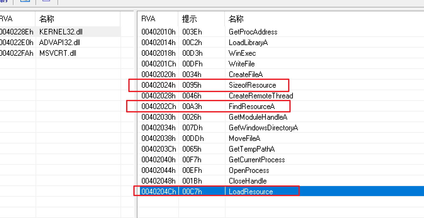 资源节太了。可能有寄宿在母体的程序。这种情况是很可能是编程者把其他文件以资源形式存在了母体内。等适当的时候调用FindResource, LoadResource, LockResource, FreeResource等一系列API释放出来。查看导入表,找到了这些API基本上可以确定了: