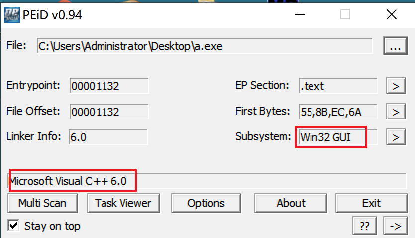 拖入PEID,发现没有加壳, 是用VC++编写: