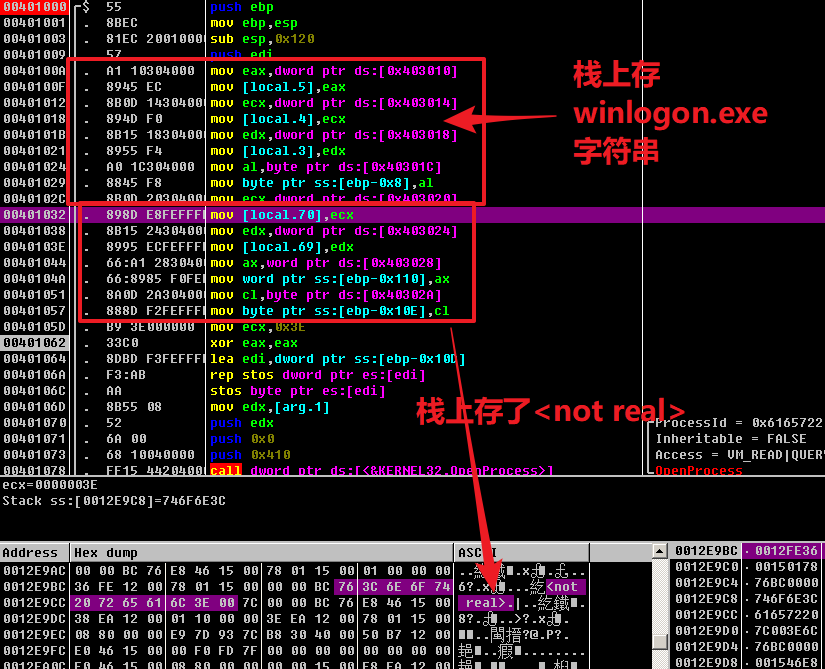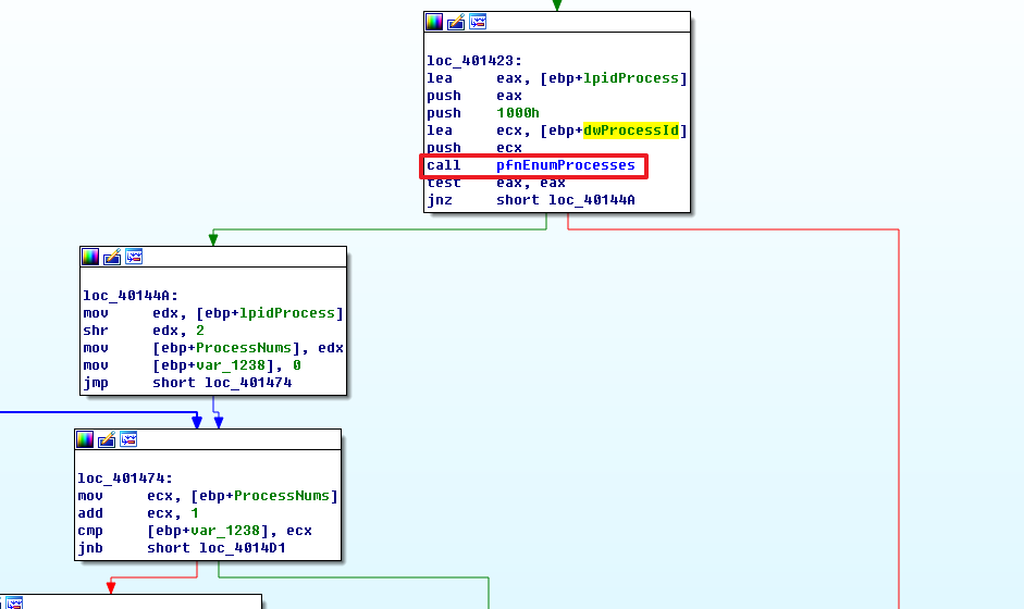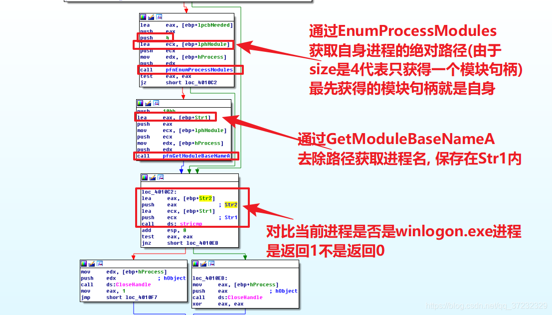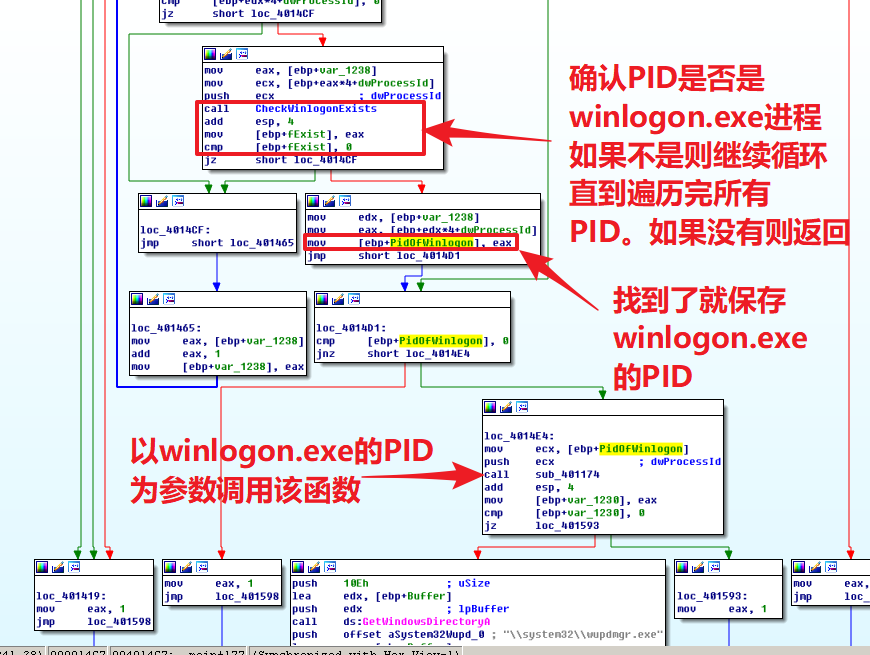 现在完全确认了该函数的功能是遍历当前所有进程后寻找winlogon.exe是否存在。将其改名为CheckWinlogonExists