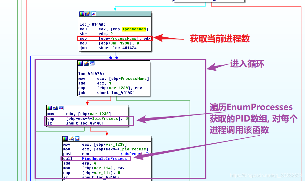 进入循环遍历PID数组,对每个进程调用FindModuleInProcess函数