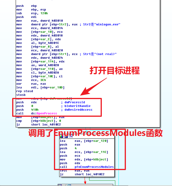 赋值完后就打开目标进程后调用了EnumProcessModules