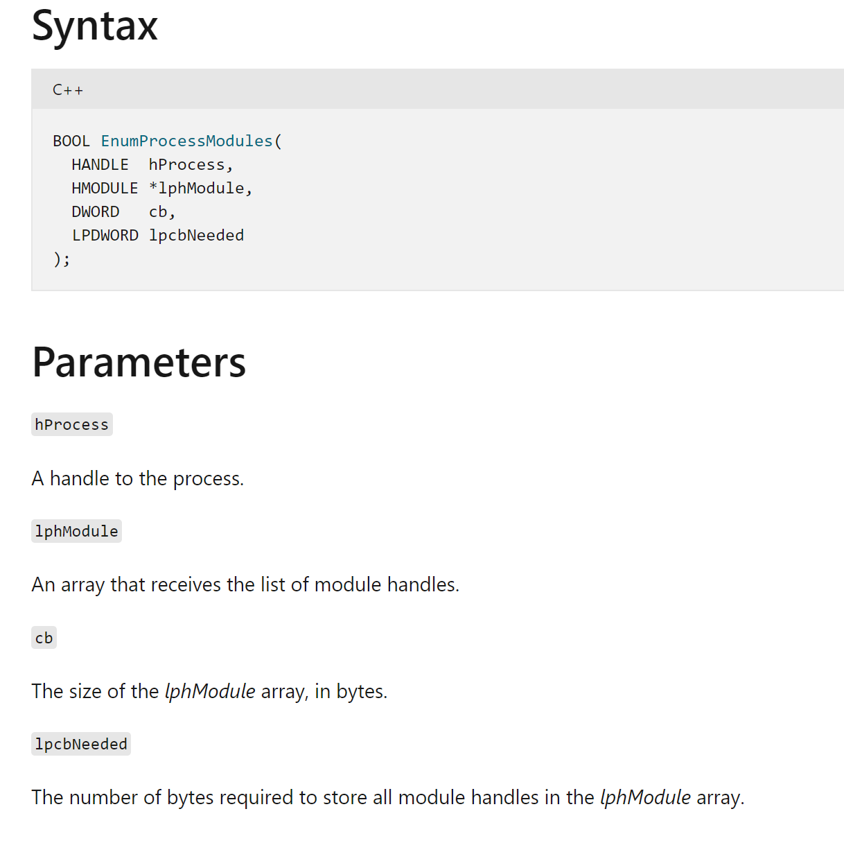 查看一下该函数, 该函数可以获取进程内所有的模块句柄的数组。首先第一个获取的是自身模块的句柄