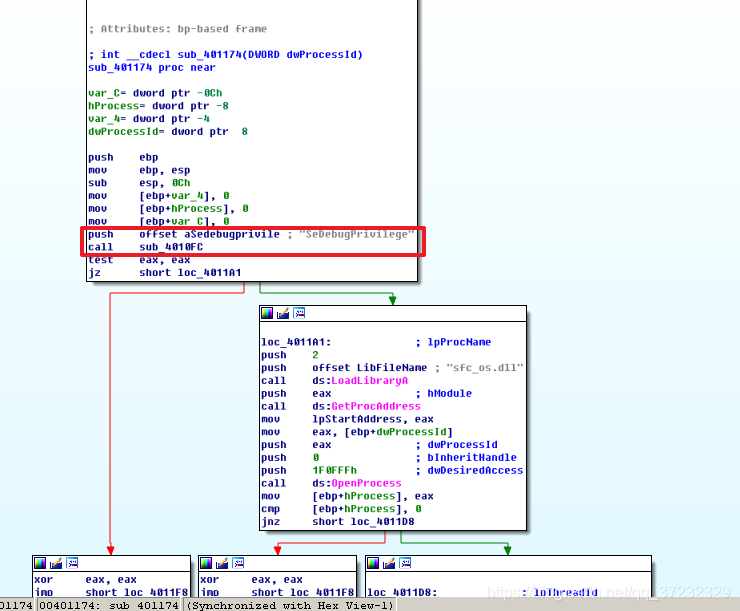 进入sub_401174函数, 看到了以SeDebugPrivilege为参数调用的sub_4010FC。猜测这是获取DEBUG权限的提权功能函数