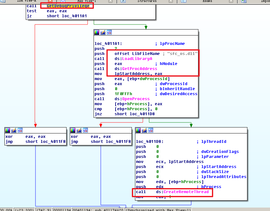 返回之前后继续往下分析, 调用GetDebugPrivilege后获取DEBUG权限。通过动态调用方式获取sfc_os.dll库内的某个函数作为远线程函数。并远线程注入winlogon.exe