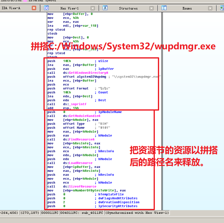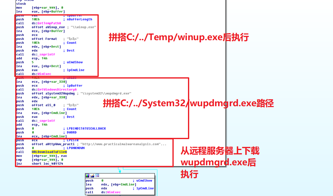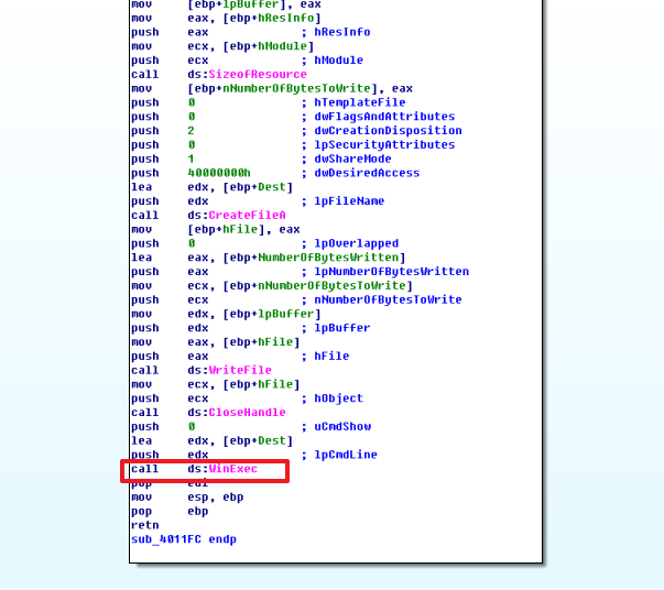 释放资源后调用WinExec来执行生成的wupdmgr.exe