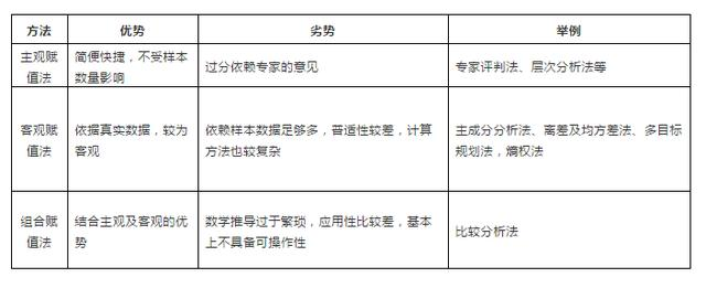 确定评价指标权重的常用方法主要有:主观赋权法、客观赋权法和组合赋权法,各类方法间的比较见下表。