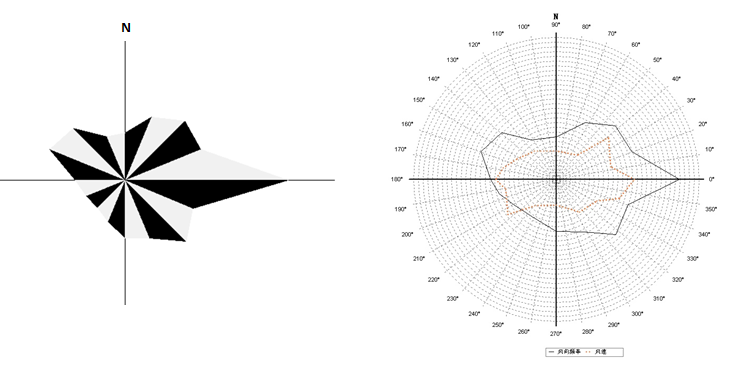 风玫瑰图是根据某一地区多年平均统计的各个风向和风速的百分数值,并按一定比例绘制,一般多用八个或十六个罗盘方位表示。