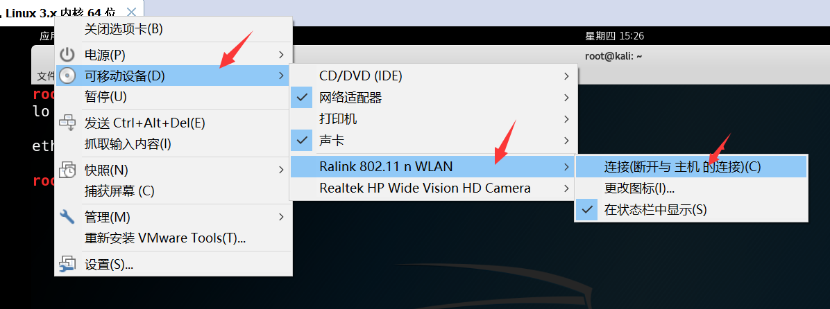 - 准备一张无线网卡,博主使用的是TP-LINK,型号TL-WN725N(任何网卡都可以啦)。插入网卡,在虚拟机界面右击,按照下图所示,点击连接,将无线网卡连接在kali上