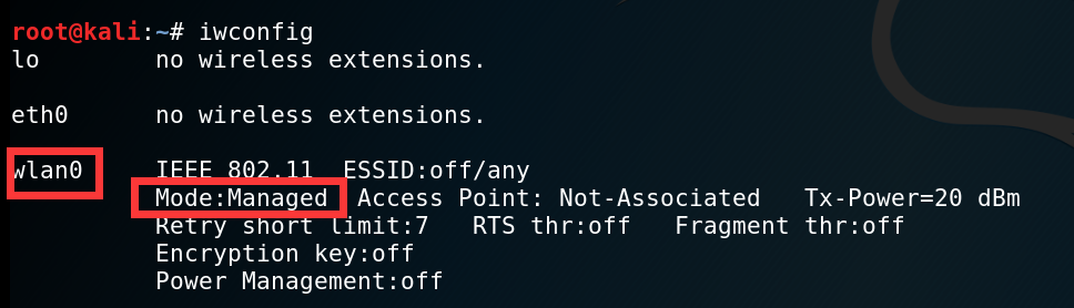 可以看到此时网卡名称是wlan0,模式是managed模式