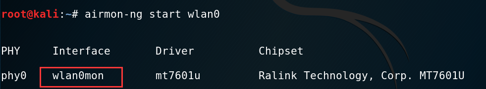 然后我们启动网卡监听模式 airmon-ng start wlan0 。执行完命令后我们看到我们网卡的名字由“wlan0”变成了“wlan0mon”,他表示我们的网卡已经成功处于监听模式。(注意:网卡名称偶尔也不会变)