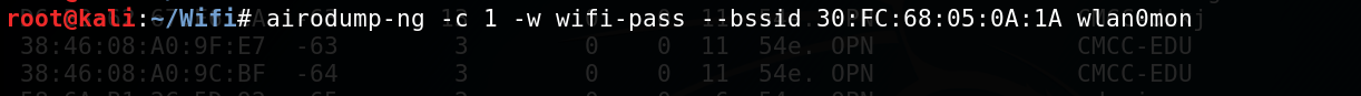 airodump-ng -c 1 -w wifi-pass --bssid 30:FC:68:05:0A:1A wlan0mon