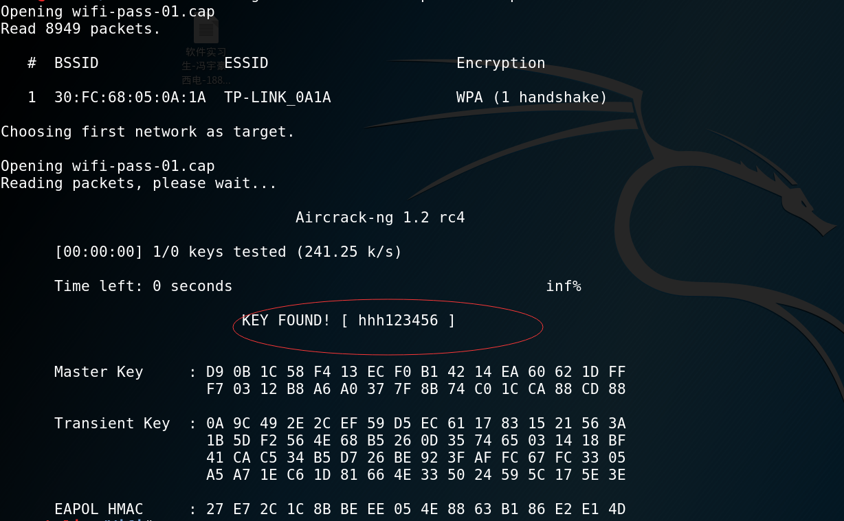 因为我的密码本里只有一个自己wifi的密码,所以只对比一次即可找到密码。密码如圈中所示。如果是一般情况的话,我们要采用标准密码本破解,除了kali自带的密码本之外,还可以去github上找。