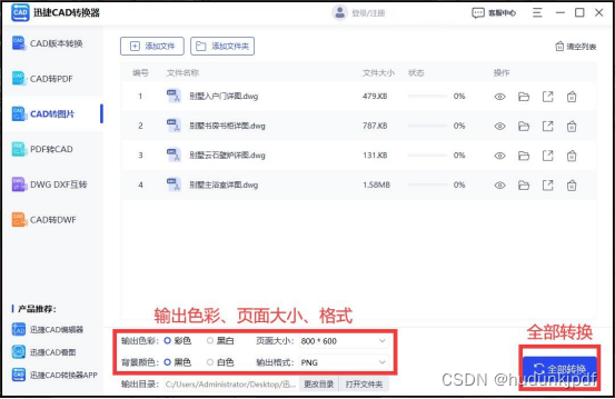 2、文件添加进来后,在页面下方选择输出的色彩、页面大小和图片格式,最后点击“全部转换”,CAD就会转换成JPG图片啦。
