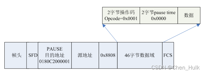 PAUSE帧中带有一个暂停时间pause_time,表示接受设备请求暂停传送数据的时长。暂停时间以“量子”为单位,每量子等于512位时间,可暂停的时间范围为0-65535量子。
