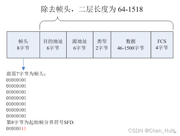 帧开头是64位的帧头域,作用为在实际内容来之前同步数据流,SFD结束表示帧内容到来。