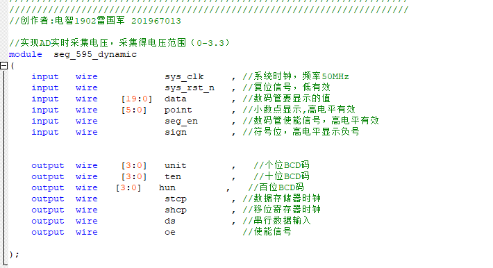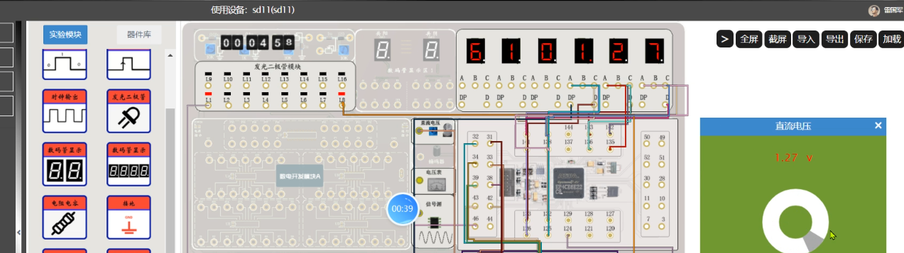 这次组合逻辑实验,我设计的实验项目是电压表设计,刚开始考虑过一些简单的组合逻辑项目,但是做着做着发现虚拟实验平台上提供了AD模块,在网上查阅相关资料后,发现是可以在自己能够接受的实验范围之内,难度也不是特别的大,经过自己几天的时间研究琢磨,终于研究出模块的使用方法,并且利用FPGA搭建好外围电路用来驱动AD模块实验电压采集并且通过数码管进行显示,期间主要困扰我的是仿真过程,由于并没有找到类似的仿真模块,我只能进行比较粗略的范围仿真,实际操作时比较费时间。