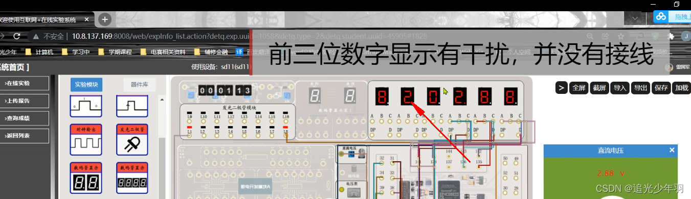 1)有的时候转换不稳定,我预期估测应该是实验室网络不稳定,并且会出现有时数码管并没有连接线都会显示数值,如下所示: