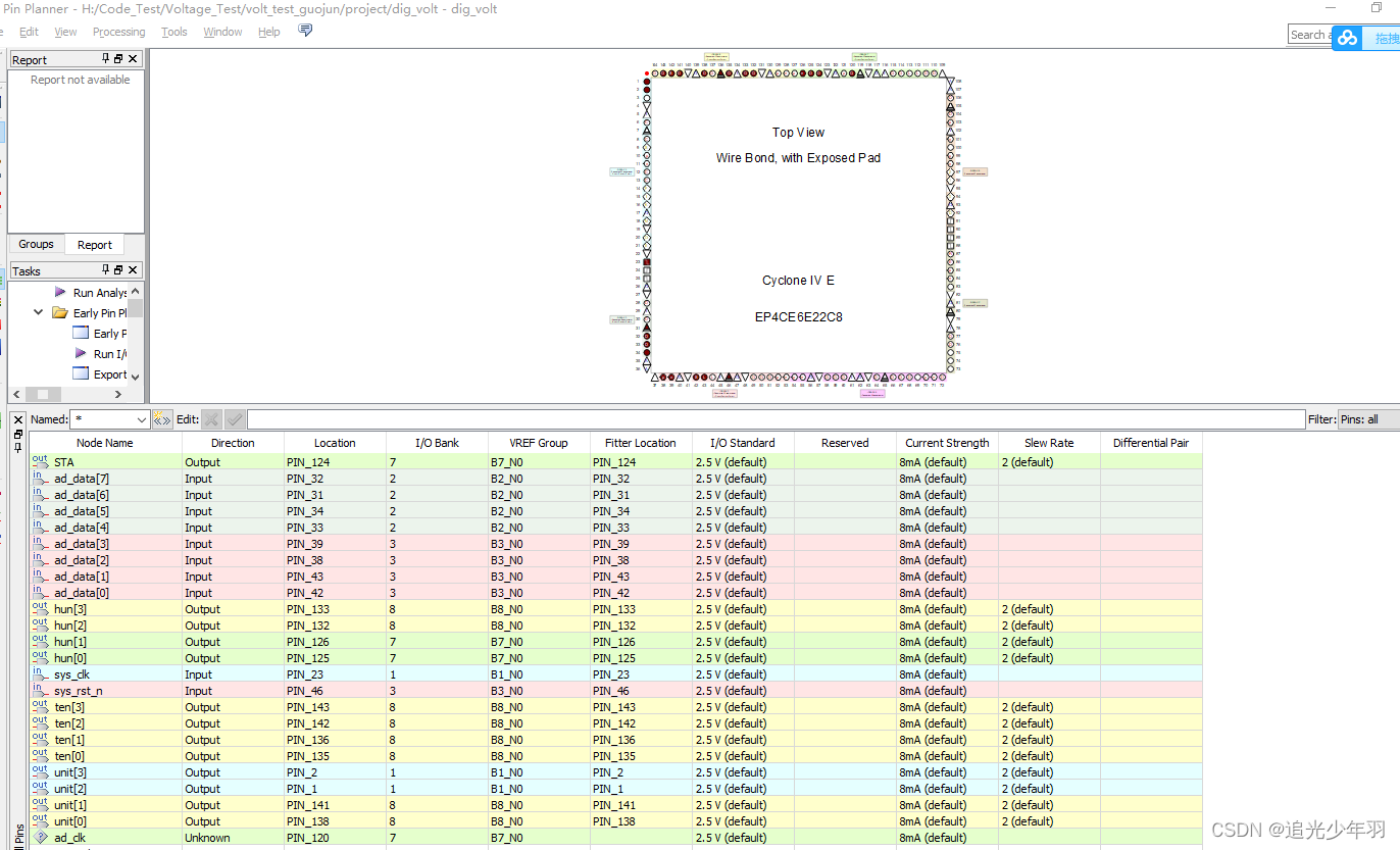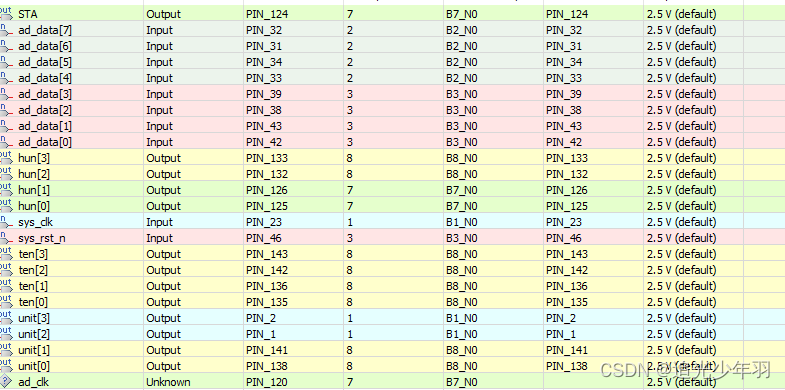 1)将ADC模块的输出引脚对应FPGA的对应输入引脚