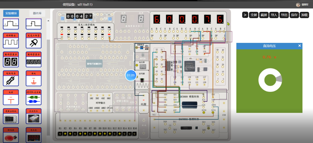 3)虽然这次实验看上去精确度比较高,但是实际上只有8位的精确度,也就是本次实验采用的AD模块只有8位的转换精准度,之所有看不出实验区别,是因为我们虚拟平台上的直流电源也是只有8位的精准度,只能产生0.01V的精准电压,并不能再产生更加精准度的电压值。