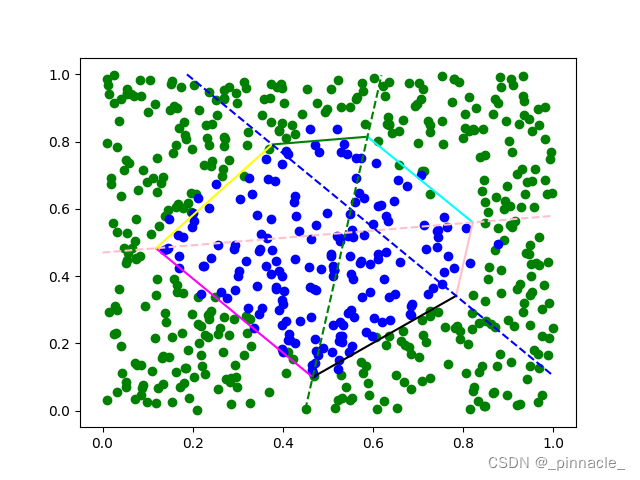 H = { x ∣ w r T R e L U ( w 1 T x + b 1 ) + b r = 0 } H=\{x \mid w_r^TReLU(w_1^Tx+b_1)+b_r = 0\} H={x∣wrTReLU(w1Tx+b1)+br=0}需要说明的是,这个超平面和我们理解的线性超平面不同,它不再是简单的线性了,而是分段线性函数(Piecewise Linear Function)或分段超平面所组成的决策面,如图: