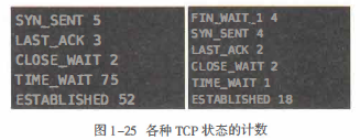 图1-23中的红色字体所示的 TIME_WAIT和 CLOSE_WAIT分别表示主动关闭和被动关闭产生的阶段性状态, 如果在线上服务器大量出现这两种状态,就会加重机器负载,也会影响有效连接的创建, 因此需要进行有针对性的调优处理。