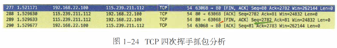 通过抓包分析,如图1-24所示红色箭头表示B机器已经清理好现场,并发送FIN+ACK。注意,B机器主动发送的两次ACK应答的都是81,第一次进入CLOSE_ WAIT状态,第二次应答进入LAST—ACK状态,表示可以断开连接,在绿色箭头处, A机器应答的就是Seq=81。