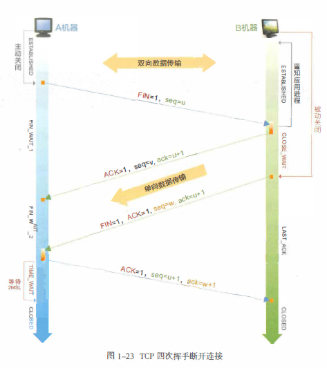 TCP是全双工通信, 双方都能作为数据的发送方和接收方, 但TCP连接也会有断开的时候。所谓相爱容易分手难, 建立连接只有三次, 而挥手断开则需要四次, 如图1-23所示。 A机器想要关闭连接, 则待本方数据发送完毕后, 传递FIN信号给B 机器。 B机器应答ACK, 告诉A机器可以断开,但是需要等B机器处理完数据, 再 主动给A机器发送FIN信号。 这时,A机器处千半关闭状态(FIN_WAIT_2) , 无法再发送新的数据。 B机器做好连接关闭前的准备工作后, 发送FIN给A机器, 此时B机器也进入半关闭状态( CLOSE_WAIT)。A机器发送针对B机器FIN的ACK后,进入TIME-WAIT状态,经过2MSL(Maximum Segment Lifetime)后, 没有收到B 机器传来的报文, 则确定B机器已经收到A机器最后发送的ACK指令, 此时TCP连接正式释放。 具体释放步骤如图1-23所示。
