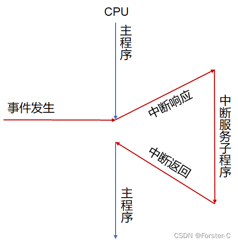 - 中断的概念:CPU执行程序时,MCU外部或内部发生某一事件,CPU暂时中止当前的工作,转到中断服务程序处理所发生的事件;处理完该事件后,CPU再回到原来被中止的地方,继续原来的工作。这个过程称为中断,CPU处理事件的过程,称为CPU的中断响应过程。