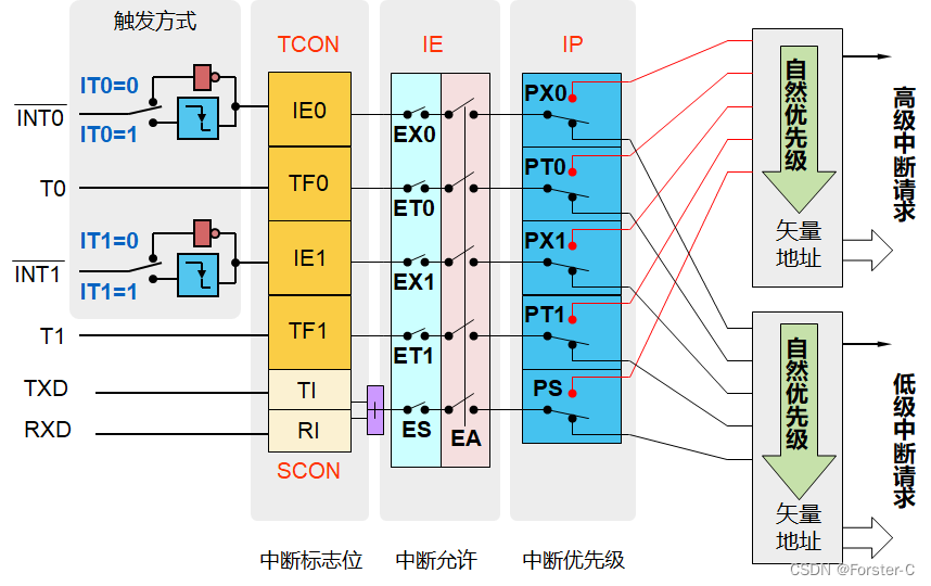 - 有4个用于中断控制的寄存器:IE、IP、TCON、SCON
