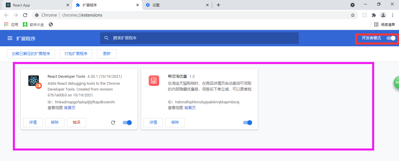 6.就是如下的界面,记得一定要把开发者模式打开再把上面那个绿色图标的文件拖到紫色区域内,然后点击确定