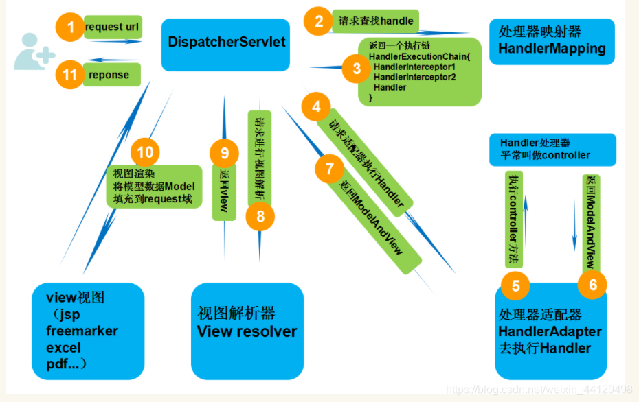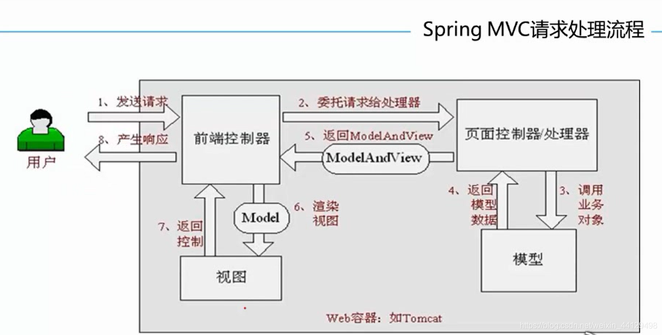 1.首先用户发送请求到前端控制器(DispatcherServlet),前端控制器根据