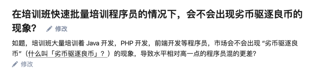 如果由市场来定的话,就不会出现劣币驱逐良币的现象了。而培训机构批量培训程序员,如果程序员优秀,那么他们就不是劣币,是良币!如果培训的不优秀,那么市场自由决定的前提下,也没有公司要!是没有价值的,公司也不会要。所以,很难出现劣币驱逐良币的现象。
