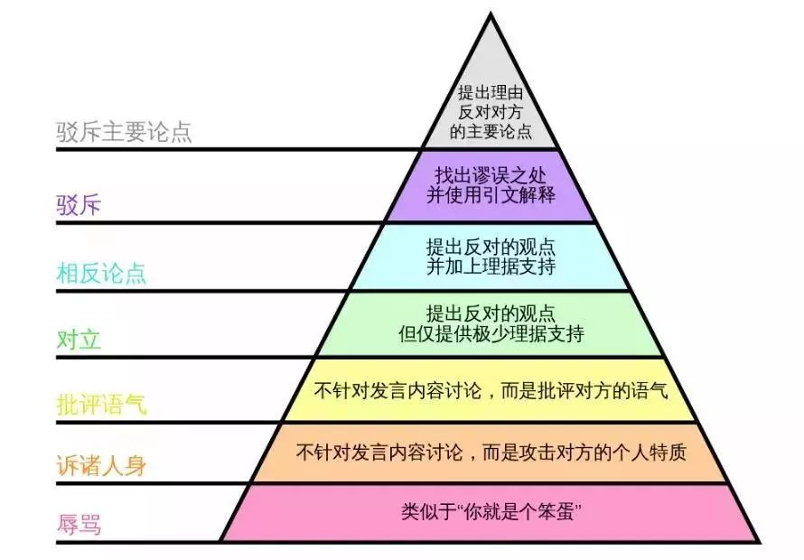 在我们日常生活中,充斥着各种各样的对话,争议,讨论和反驳。Paul Graham 把这些讨论,自下而上,从最低级到最高级,依次分成7大类。