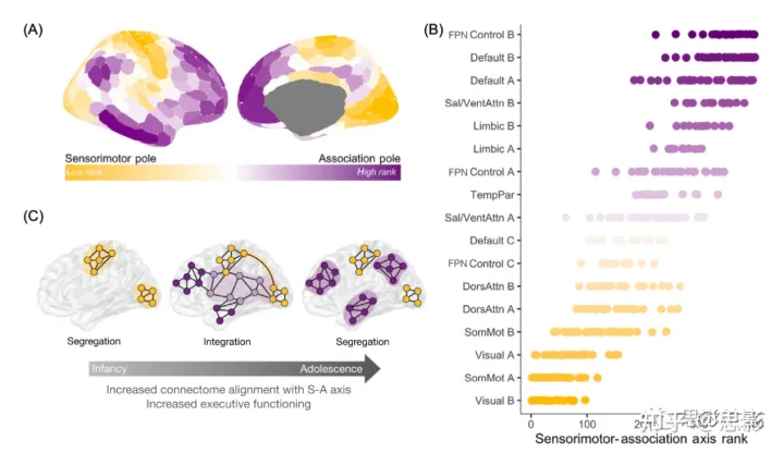 (C)功能连接体从婴儿期到成年期的长期发育是沿着S-A轴进行的,其特征可能是婴儿期低级感觉运动系统的早期分离,儿童期和青春期中轴系统和感觉运动系统的整合,以及成年期高级联合系统的长期分离。请注意,这幅插图描述了沿S-A轴的功能系统成熟的特征模式,但没有说明连接体发育的全部复杂性。我们已经说明了可能存在主要分离或整合的时期和制度,但我们承认,这些变化并不是孤立的过程。