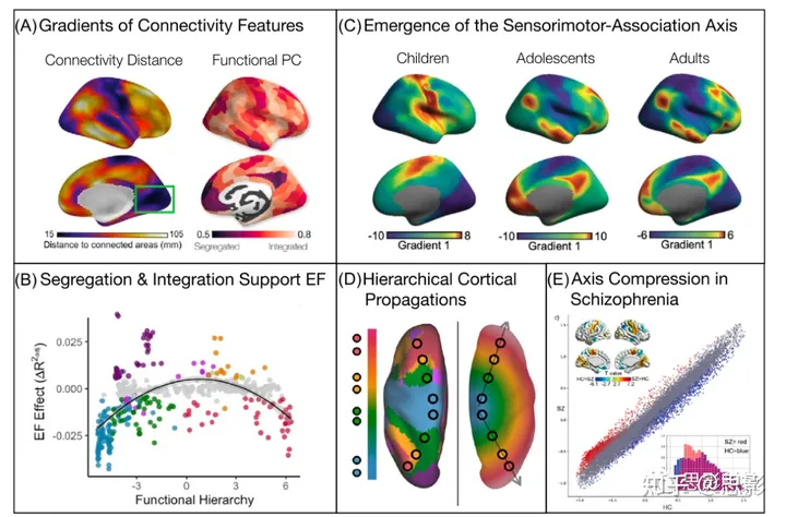 在沿S-A轴的连通性模式中出现层级组织的变化可能会导致跨功能连接体的信息流的时空协调的转变。作为横跨S-A轴的活动的方向受限的皮层传播,分层信息流似乎是可见的。在最近对青年大脑皮质活动传播的研究中,血氧水平依赖(BOLD)活动的皮质定向传播优先以自上而下(从联合皮质到感觉运动皮质)或自下而上(从感觉运动皮质到联合皮质)的方式沿S-A轴传播。因此,这些皮质传播可能代表了一种潜在的机制,通过该机制,皮质处理信息利用了分层组织的连通性基础(图2D)。