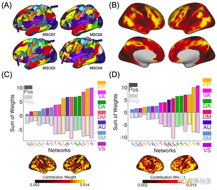 | 框2:功能系统的拓扑组织在S-A轴上各不相同 以前在人类研究中使用功能磁共振成像的研究通常利用标准化的功能系统图谱,这些图谱假定在个体的结构和功能神经解剖学之间存在一对一的对应关系。然而,使用精确功能图技术的多项独立研究表明,描述大脑皮层功能系统空间分布的功能拓扑图 (图IA)存在重要的个体间差异。值得注意的是,成年人功能拓扑图的最大变异性出现在参与许多认知任务灵活的更高级别的系统中,例如额顶控制系统。未能考虑到这种个体差异的组水平图谱可以将空间效应混叠到区域间功能连通性的测量中。 使用组水平图谱的另一种选择是推导出个性化的功能系统(也称为‘精确功能网络’),它代表了个体大脑中功能系统的空间组织。这些单独定义的系统在个体内高度稳定,并预测个体在功能磁共振任务中的空间激活模式。对青年个体定义的功能系统的第一项研究发现,在S-A轴上,功能拓扑图的个体间变异性并不是均匀的,而是在联合系统中最高(图IB),这与先前在成年人中的工作一致。此外,联合皮质的功能拓扑图定义于发育过程中(图IC),并与EF的个体差异有关(图ID),其中在额顶、腹侧注意和默认模式系统中观察到的影响最大。尽管这些系统的总空间范围与年龄保持相对一致,但系统分配的局部变化揭示了空间重新配置:成熟的变化经常集中在系统边界,这表明功能系统边界在发育过程中被细化。图I. 功能拓扑图在联合皮质中变化很大,并与年龄和执行功能(EF)相关。(A)脑功能网络的空间拓扑结构因个体而异。箭头表示在以个体定义的功能连接中存在,但在组平均功能连接图谱中不存在的功能区域。(B)青少年个性化功能脑网络的功能拓扑图的个体间变异性在联合皮质中最高。联合网络功能结构的变异性对年龄(C)和EF(D)的预测模型贡献最大。 |