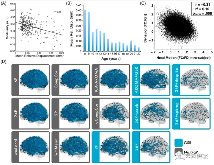 | 框3:扫描时被试运动(包括头动等)的持续挑战 虽然功能连通性为研究与EF相关的连接体发育提供了一个强大的工具,但与扫描时被试运动相关的数据质量仍然是一个重要的挑战,有可能影响研究结果。2012年,三项独立研究同时证明,少量的扫描仪内运动会系统性地影响对功能连通性的估计。这种系统性偏差对发育研究尤其重要,因为年龄与扫描仪内运动的存在密切相关:年龄较小的儿童往往比年龄较大的儿童和成年人在扫描仪中动得更多。此外,随后的研究表明,扫描仪内运动不仅与年龄有关,还与不同的人口统计学、认知和临床相关变量有关,包括EF。值得注意的是,运动对功能连通性的影响的量级比发育或认知对功能连通性的影响的量级要大。因此,不受控制的运动伪影有可能混淆关于连接体发育和与EF的关联的推断。 现在已经引入了许多技术,试图对fMRI数据进行去噪,并降低扫描仪内运动对功能连接性估计的影响。目前已有的研究已经确定,去噪方法的效果存在很大的异质性;值得注意的是,即使是最有效的方法也不能完全消除扫描仪内运动的影响。因此,建议使用有效的去噪方法,并在假设检验中评估所有残留的伪影对统计模型的影响。使用这些保守方法的研究表明,充分控制运动可以显著减弱先前报道的与发育相关的功能连接性随距离的变化,而与年龄相关的系统分离的增加仍然很强 (图I)。图I. 头部运动与年龄、功能连通性和执行功能有关。头部运动与模块化程度(衡量分离的一种方法)降低有关。头部运动随年龄增长而减少。头部运动与流体智力的行为测量有关。对于每种去噪策略,显示了与264个节点的Power网络中的与被试运动显著相关的边。根据效果对去噪策略进行排名,全脑平均信号(蓝色)回归的策略始终被列为表现最好的策略。缩写:FC,功能连通性;FD,逐帧位移;GSR,全脑信号回归。 |