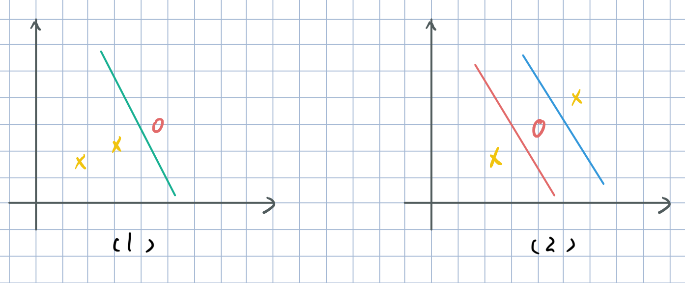 ( x i , y i ) (x_i,y_i) (xi,yi)就是上面的一个点 y i y_i yi代表着这个数据的真实标记, y i = + 1 → y_i=+1\rightarrow yi=+1→o & y i = − 1 → \&\ y_i=-1\rightarrow & yi=−1→x,可见图1中用一条直线可以完全分开所有数据,那么图1中的数据集就是线性可分的,而图2中无论是红线还是蓝线都无法完全分开两种类别,那么图2的数据就是线性不可分的,用线性可分的数据集就表明完美的超平面即 w ⋅ x + b = 0 w·x+b=0 w⋅x+b=0是存在的,我们有可能可以找到它。
