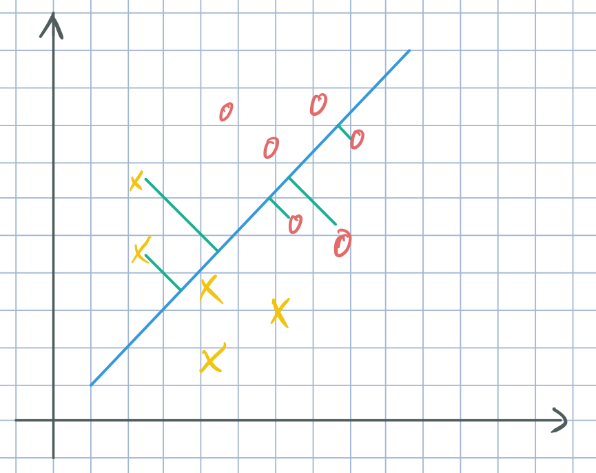 我们选择误分类点到超平面的总距离作为损失函数,也就是下图绿色线条代表距离的总和: