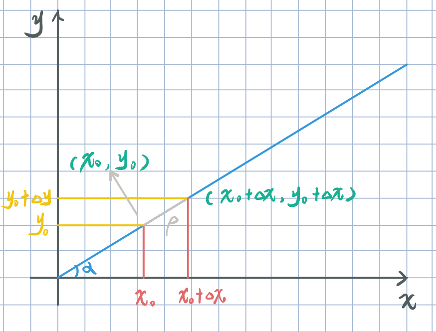 方向导数,其实描述的也就是在某个方向上函数的变化率,如图我们得到一个初始点为 ( x 0 , y 0 ) (x_0,y_0) (x0,y0),在蓝线上变化 ρ \rho ρ的长度,达到点 ( y 0 + △ y , x 0 + △ x ) (y_0+\bigtriangleup y,\ x_0+\bigtriangleup x) (y0+△y, x0+△x),可见在 x x x轴与 y y y轴上的变化分别是 △ x \bigtriangleup x △x与 △ y \bigtriangleup y △y,根据导数的定义我们可以写出 z z z在 x x x方向上的偏导: