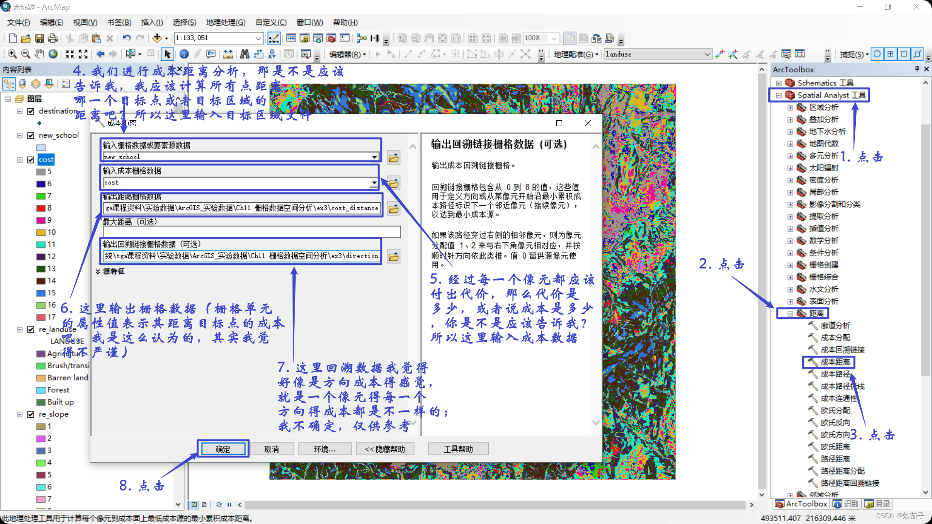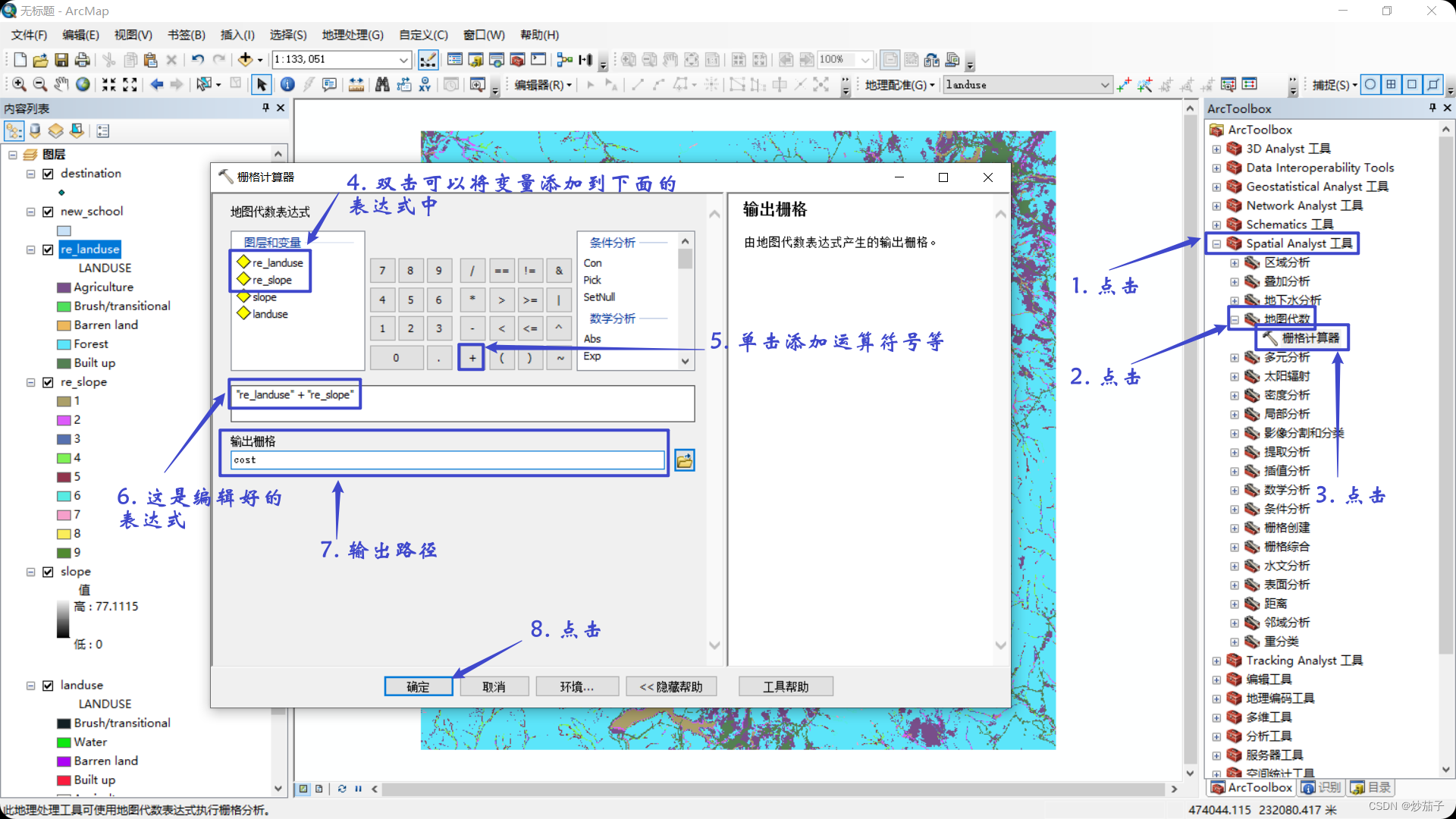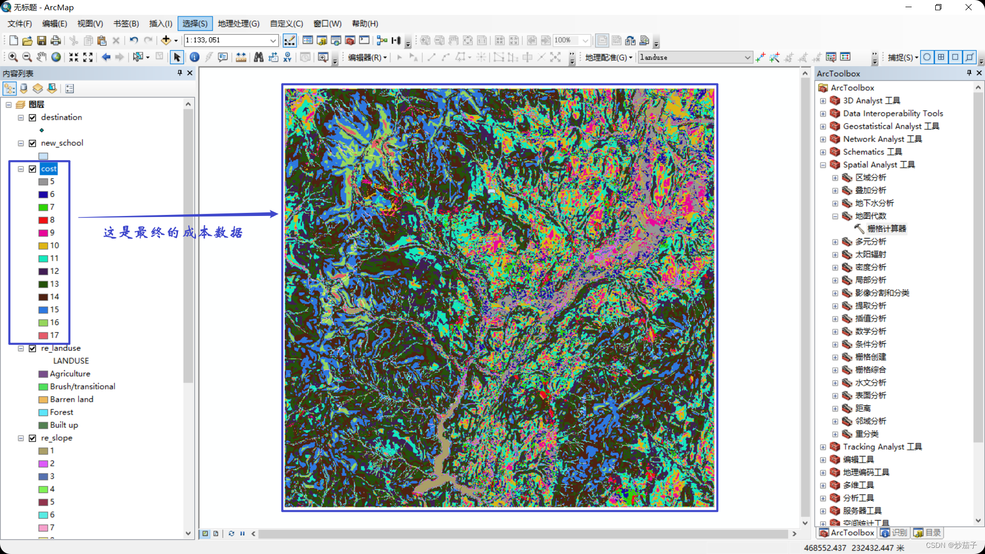 接着我们需要对两个重分类结果进行栅格相加(使用栅格计算器);然后使用成本距离分析工具进行距离分析,得到距离新学校的附近区域的成本数据;