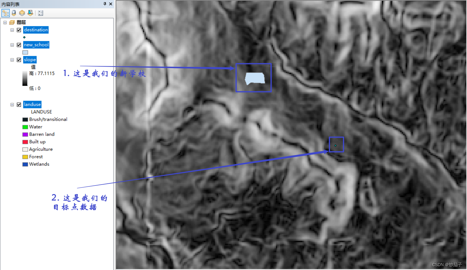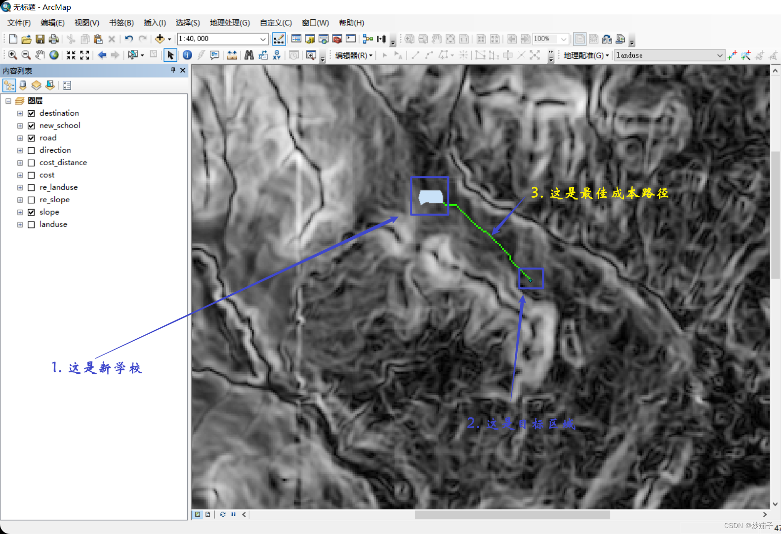 我们新建了一个学校(new_school.shp),但是我们希望在学校和目标(destination.shp)之间修一条路,现有附近区域的土地利用数据,坡度数据。问如何路径如何修建更为合适?