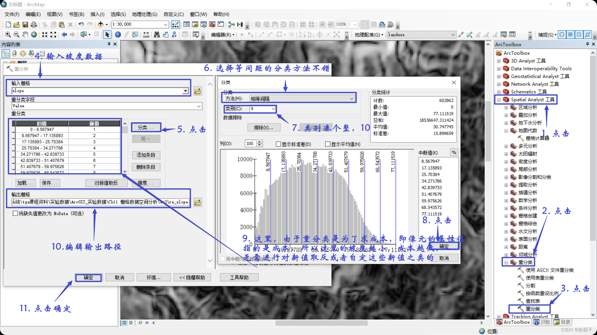 由于已经有坡度数据,所以我们需要对坡度数据进行重分类,使得坡度小的区域其值越小(因为地势陡峭的区域修建道路的成本更高,地势平坦的区域修建道路的成本越低);