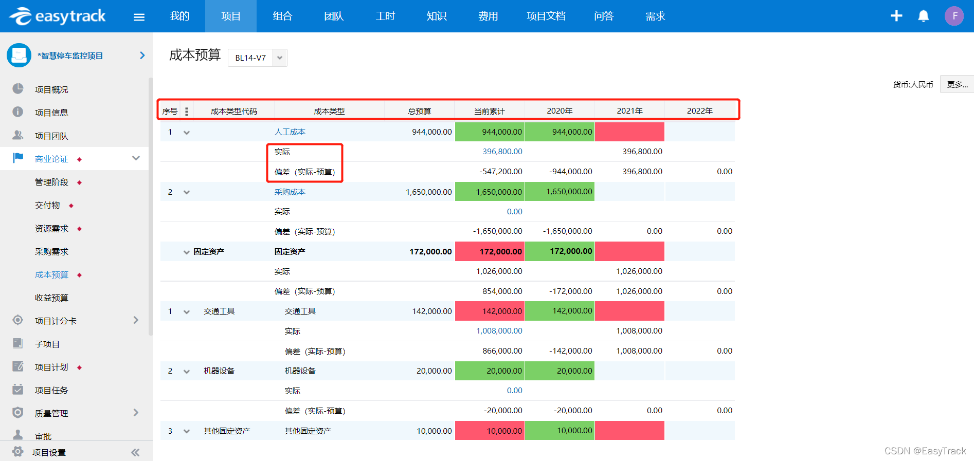 除人员成本以外的管控,易趋系统通过成本预算进行多类别(采购成本、无形资产、固定资产等)精细化分类管理,系统自动搜集最新项目成本信息,自动对比实际与计划成本,生成成本管控报表,为项目经理提供最精准的成本数据。(详见图5)