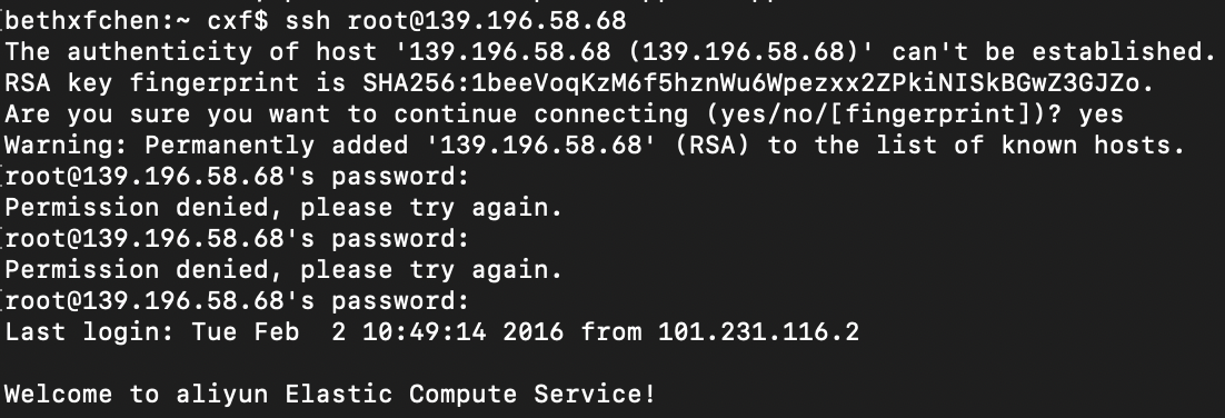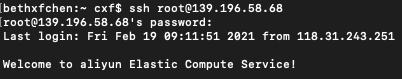 首先,ssh远程登录到OSS Python环境的ECS服务器,使用外网地址(弹性IP),用户名和密码。