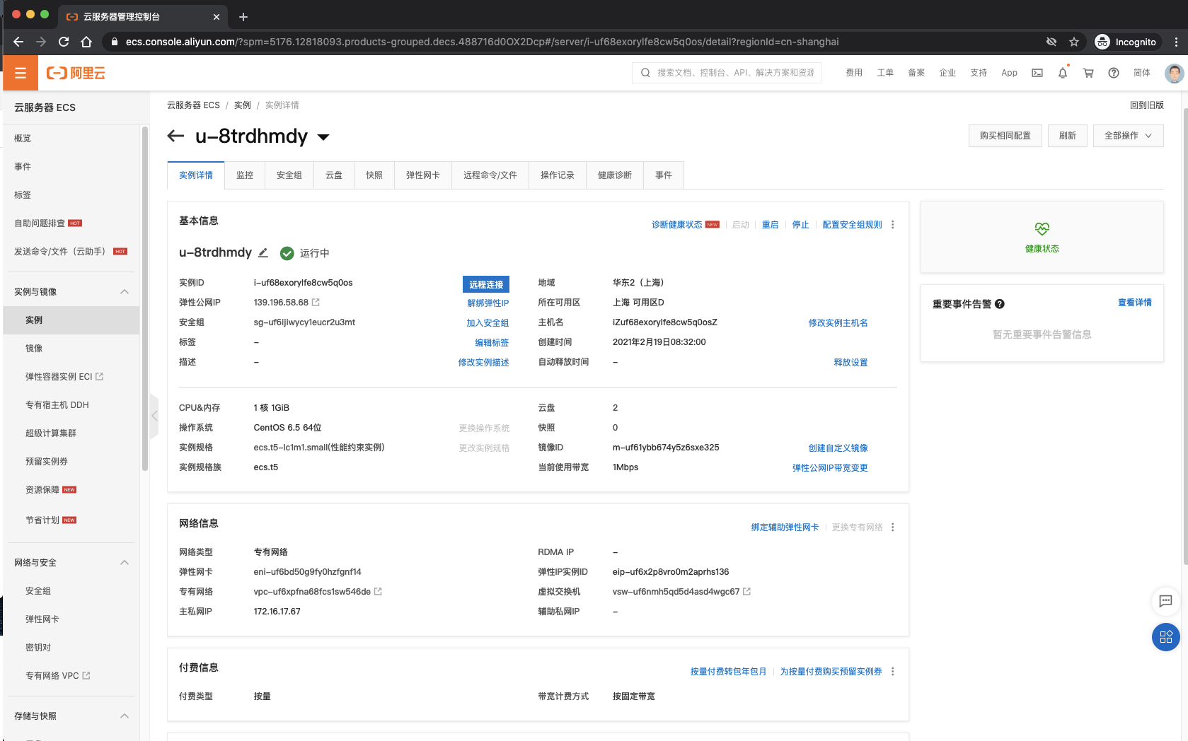--实例(Instance):是一个虚拟的计算环境,由CPU、内存、系统盘和运行的操作系统组成;ECS实例作为云服务器最为核心的概念,其他资源,比如磁盘、IP、镜像、快照等,只有与ECS结合后才具有使用意义。