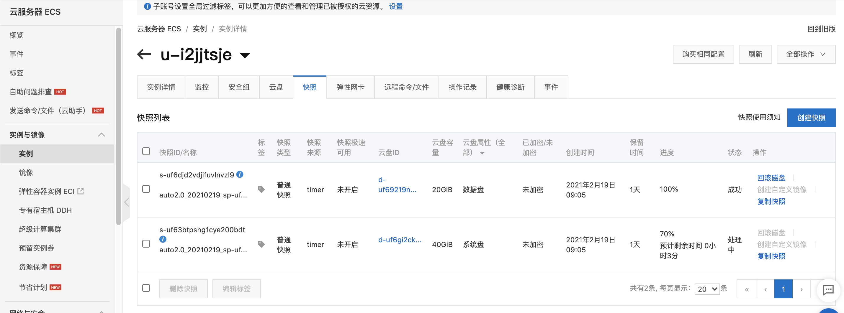 实例ID为 u-i2jjtsje 的实例包含两个磁盘:20G的数据盘和40G的系统盘: