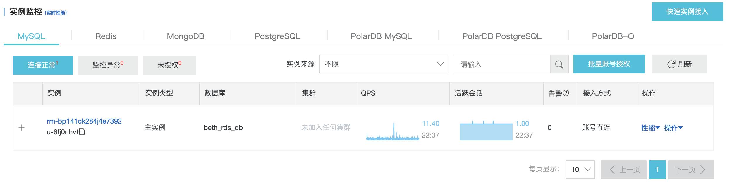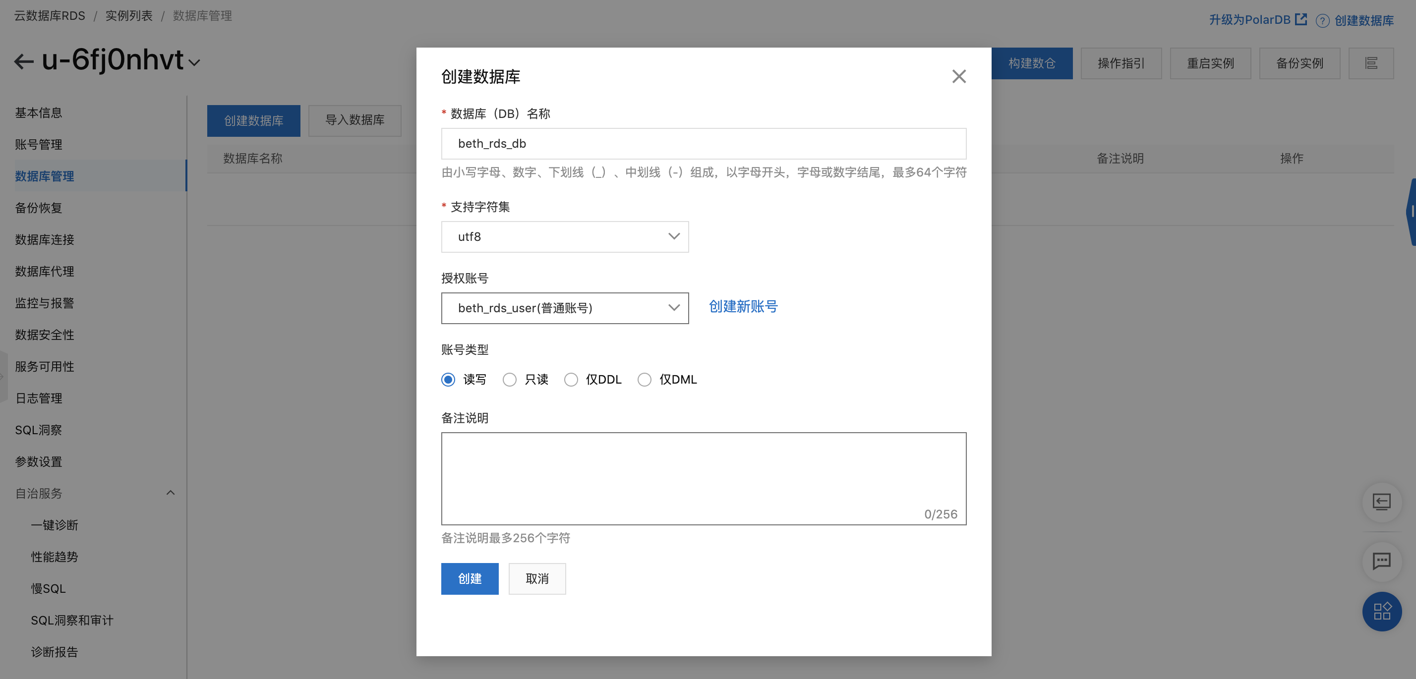 在使用 RDS 数据库之前,需要在 RDS 实例中创建账号。同一实例下的数据库共享该实例下的所有资源,其中: