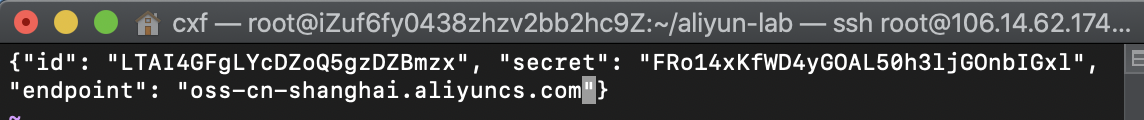 使用OSS API进行文件上传和下载之前,用户需配置阿里云账号的AccessKeyID,AccessKeySecret和Endpoint信息,以便于通过 OSS 的权限验证。在 ECS 命令行中,使用命令 cd aliyun-lab 进入 aliyun-lab 目录。 然后,使用命令 vim configure.json ,configure.json 文件用于提供调用 OSS API 时所需的公共参数。